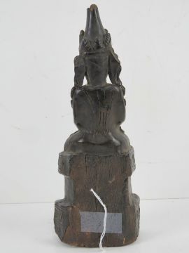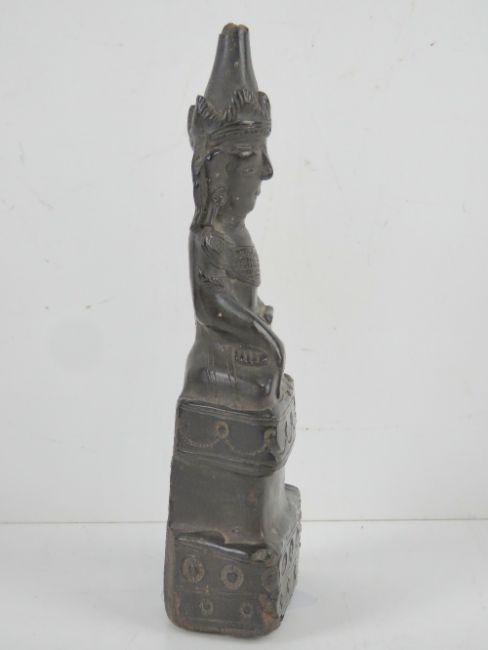 An unusual leather covered wooden shrine figurine, probably Tibetan, Buddhist Lama in seated position, slightly a/f, standing 23cm high.