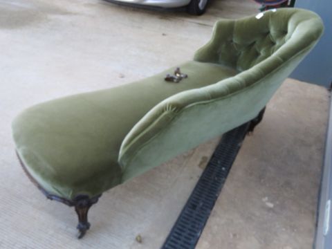 An Edwardian button back chaise lounge raised over shaped and scrolled legs. Old repair having come apart to front leg (parts present) all raised over brass castors, 180cm in width.