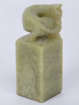 A 19th century Oriental square shaped jade seal surmounted with carved horse upon, standing 7cm high.