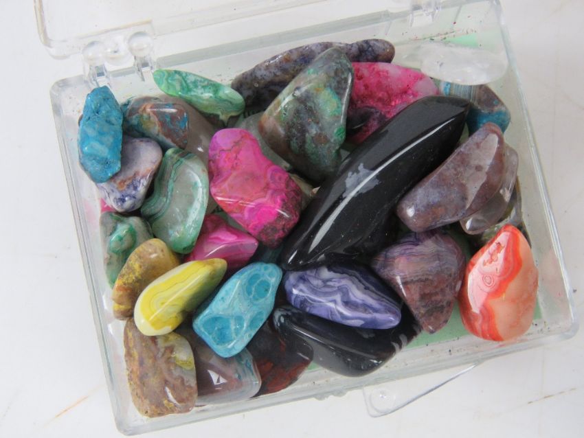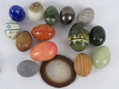 An Indian agra pierced and flattened plate together with a quantity of 'eggs' iincluding some marble and agate examples, a geode slice and a quantity of coloured Grand Canyon stone samples.