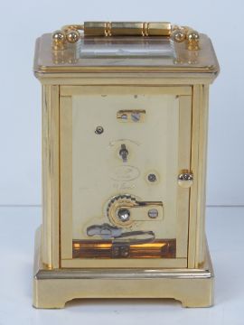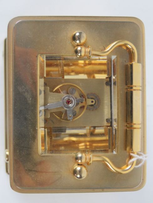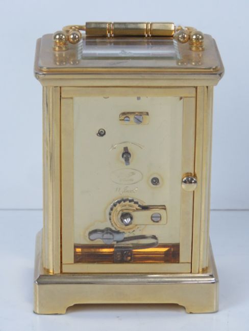 A fine heavy brass five glass carriage clock, enamel dial with eleven jewel movement, swing handle over, 15cm high. With double ended key.
