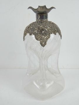 A late Victorian 'Glug glug' waisted decanter having overlaid silver decoration and spout, hallmarked Birmingham 1900, stopper a/f, all standing 21cm high.