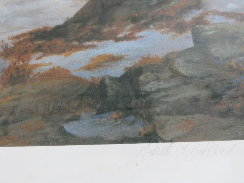 A signed print of an original painting by Elizabeth M Halstead entitled 'Valley of the Stags' depicting stags in heather with mountains beyond, signed and entitled in pencil under, sight size 76 x 50.5cm, framed and glazed.