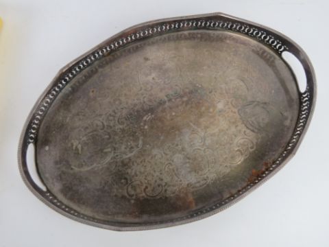 A quantity of silver plated Kings pattern cutlery, together with a silver plated galleried tray, a brass handball and brass oil lamp with chimney and shade.