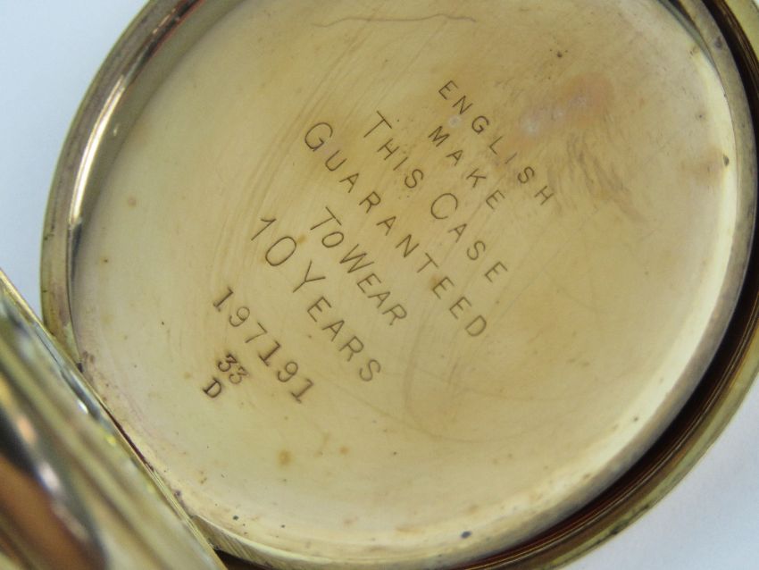 A gold plated top wind full Hunter pocket watch having viewing pane with black enamel chapter ring to front, opening to reveal white enamel dial with subsidiary seconds dial, blue steeled hands, 15 Jewel movement, Dennison Star watch case, 50mm dia, total weight 109.4g.