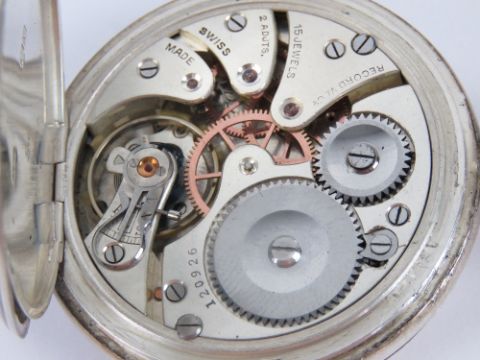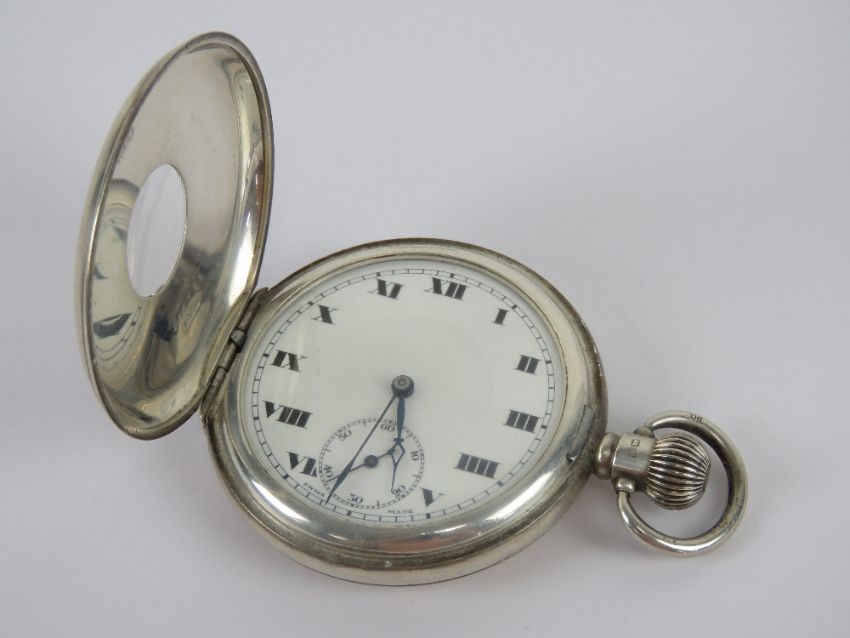 A HM silver top wind full Hunter pocket watch having viewing pane with blue enamel chapter ring to front, opening to reveal white enamel dial with subsidiary seconds dial, blue steeled hands, 15 Jewel movement marked Record W.Co, Dennison watch case hallmarked Birmingham 1923, 50mm dia, total weight 115.8g.