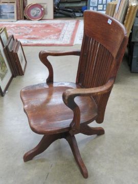 A good 1930s oak swivel office chair raised over quatroform base and having sprung back.