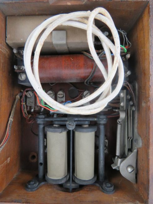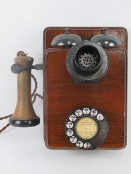 A vintage GPO telephone having handset, rotary dial and twin hemispherical bells over wooden bell box, marked to back GPOC23235 121F.
