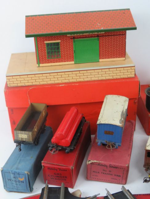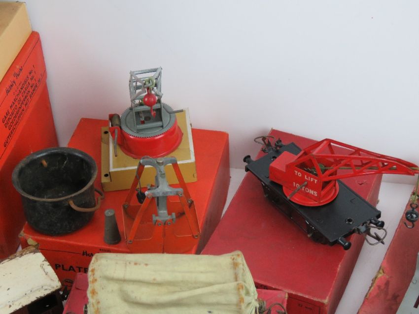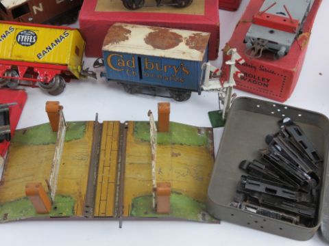 A Hornby Meccano train set inc boxed platform building, boxed trolley wagon RS684, boxed gas cylinder wagon R161, covered wagon having fabric top in box without lid W606, a Cadbury's chocolate wagon, boxed crane truck R157, level crossing, acute angle crossing in box, right angled crossing in box, etc.