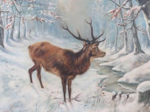 Oil on canvas; a stag in snowy forest, signed lower left Lutllrustrueiz '48, 80 x 64cm, framed.
