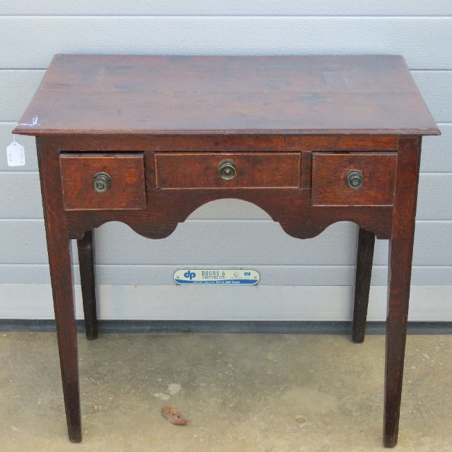 A late 18th/early 19thC country made low boy. Single frieze flanked by twin box drawers, cupids bow aprons to each side, all raised over square tapering legs. 76 x 45 x 72cm.
