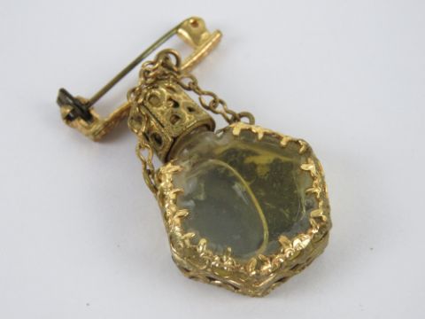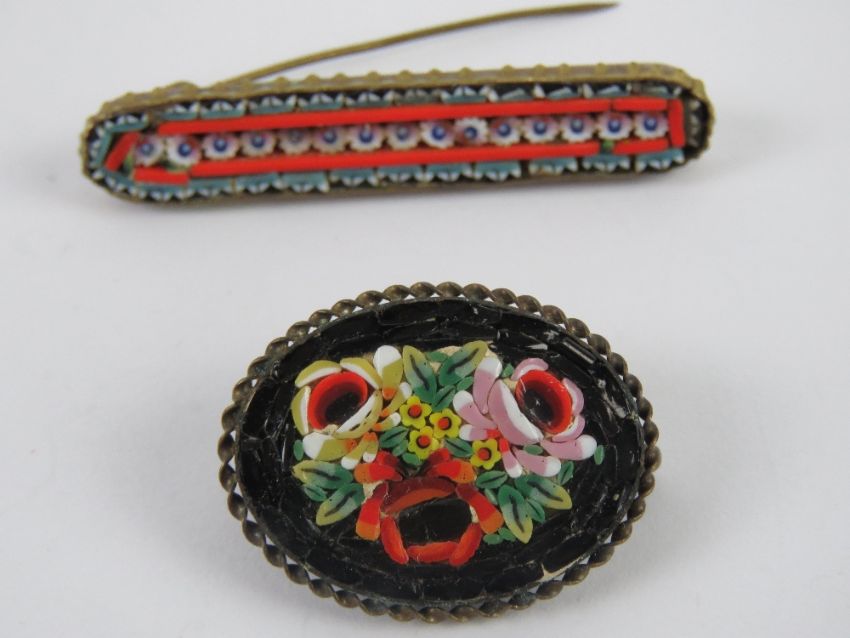 Two micro mosaic brooches, one marked made in Italy, together with a Czechoslovakian style brooch having perfume bottle suspended below, also two other 20th century brooches.