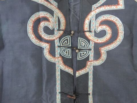 Two late 19th/early 20thC Qing Dynasty hand embroidered Chinese robes in original unrestored condition. One in cream ground with floral pattern being over embroidered with dragon design and clouds in white and red. The other in black ground having applied pattern in floral fabric.