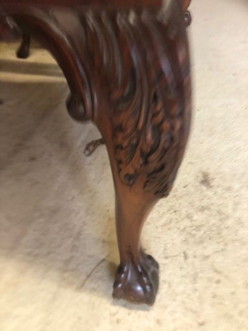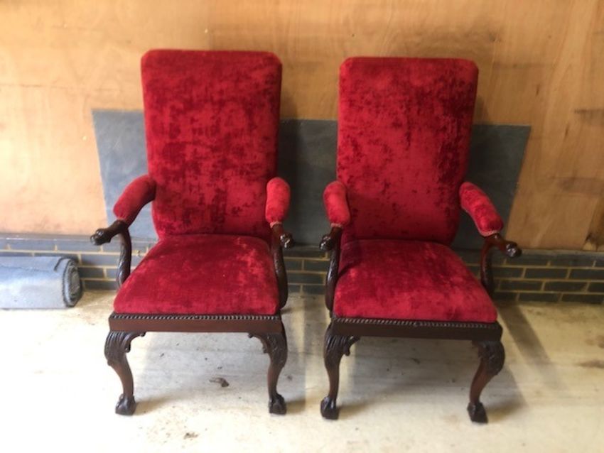A fine pair of mahogany high back hall chairs. Each with upholstered elbows, carved otter mask arm terminals and all raised over cabriole legs termating in ball and claw feet. Prov. Tryingham Hall.
