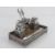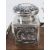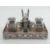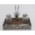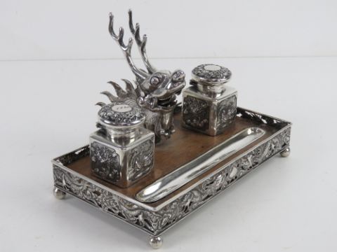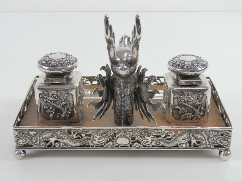 A superb 19th century Chinese Qing Dynasty silver and wood decorative desk standish bearing marks for Luen Wo of Shanghai. The central two stepped pen stand in the form of a mythical beast / dragon, flanked by a pair of inkwells having embossed character and floral panels. Pen rest inset to the front of the wood base framed with pierced silver floral lattice raised on bun feet supports, bearing LW markers mark and Chinese characters. One glass inkwell liner a/f, the other deficient. Base approx 19.5 x 11cm. Total weight 683g.