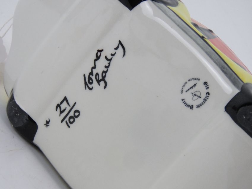 A Lorna Bailey teapot in the form of a racing car, 'DECO 1' pattern, signed to base and numbered 27/100, 23cm in length.