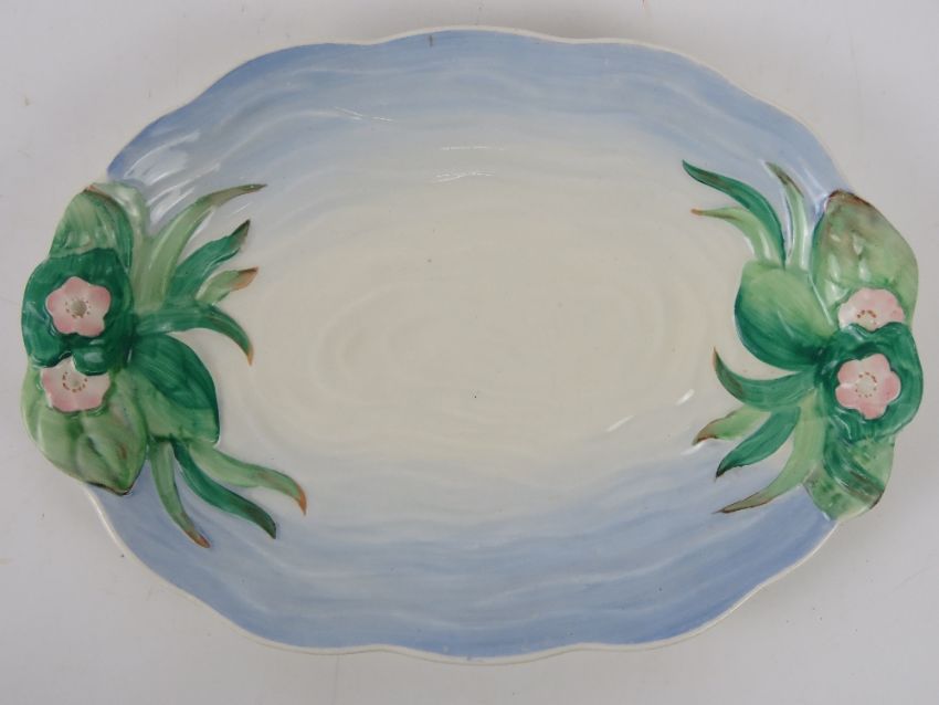 A 1930s Clarice Cliff serving plate of rippled pond design bearing green back stamp, pattern 982, 29cm wide.