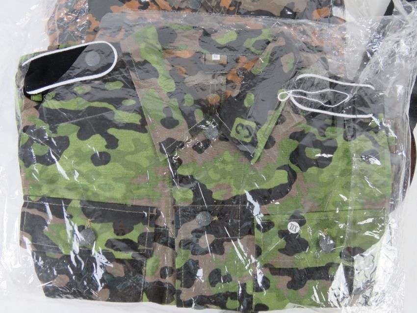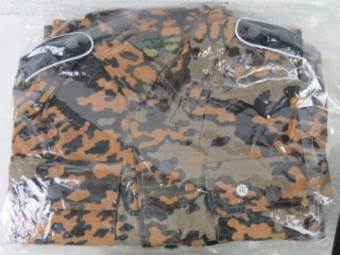 Two re-enactor's German SS dot Camo smocks both XXXL, brand new in wrapping, together with a set of leather 'Y' Straps.