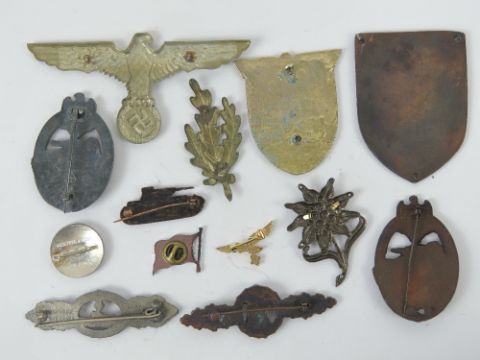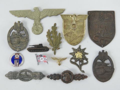 A quantity of assorted reproduction WWII German badges. Thirteen items.