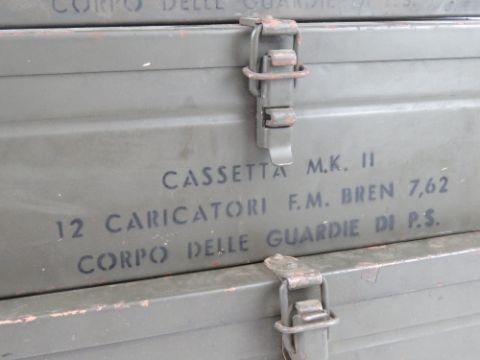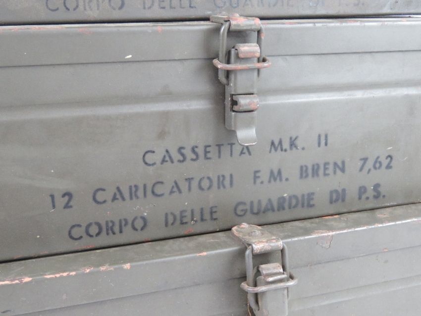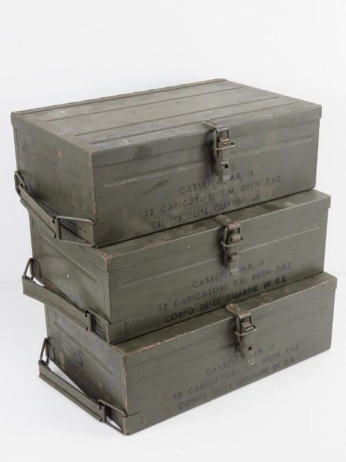 Three rare .3006 Italian Bren Mk II 30rd magazine boxes, each to fit 12 magazines, (contents deficient). Contents deficient. Stencilling upon.