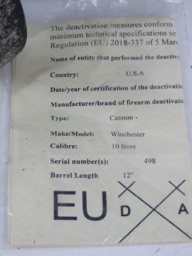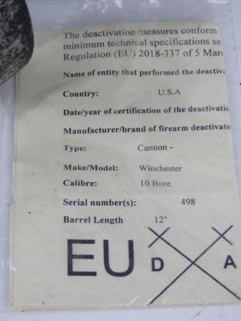 A deactivated 10 bore table top starting cannon with deactivation certificate.
