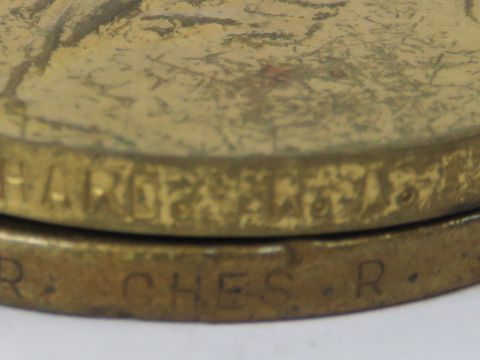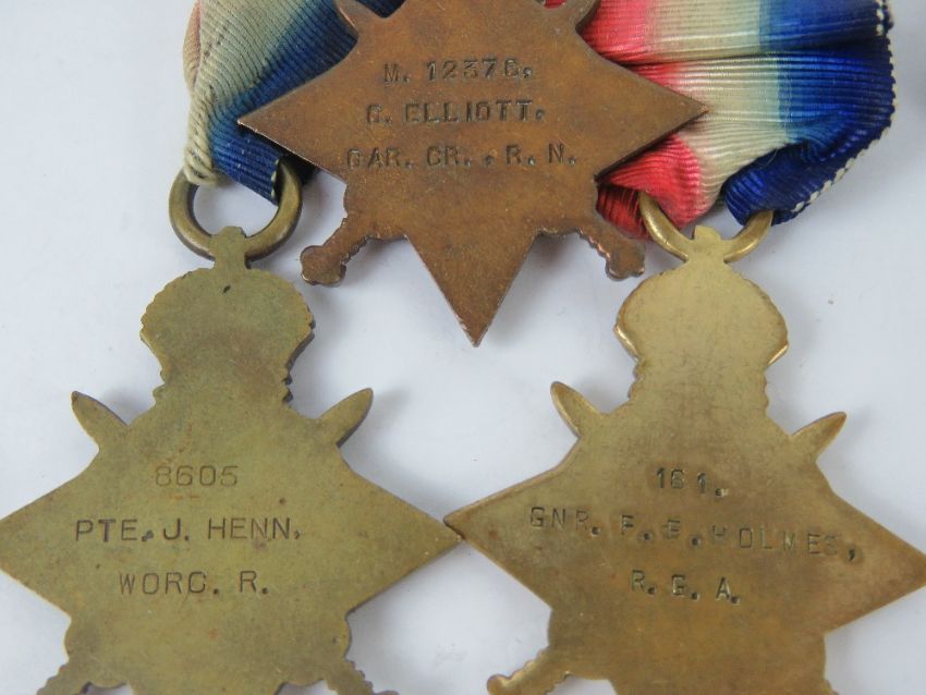 Five WWI British medals inc three 1914-15 medal for PTE J Penn Worcestershire Regiment 8605, GNR FF Holmes RGA 161 and C Elliott 12376 respectively, two Victory medals for GNR B Blanchard RD 2855 and PTE J Baxter Cheshire Regiment 019 respectively. Also a medal bar. Six items.