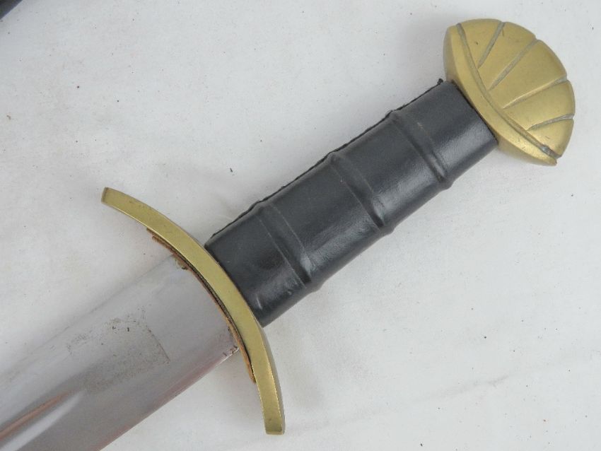 A re-enactor's Medieval style sword with leather covered grip, brass pommel and scabbard.