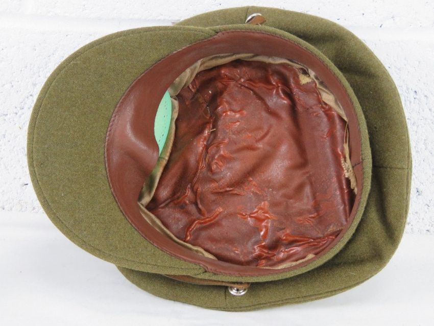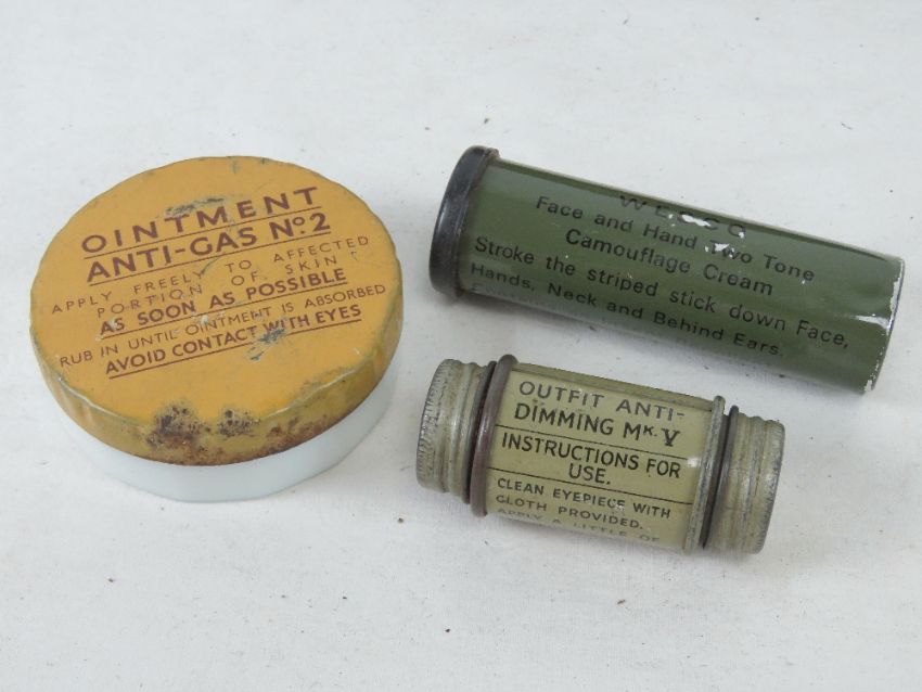 A quantity of British army personal equipment inc peak cap, first aid book, two belts, anti-dimming compound, anti-gas ointment, and camouflage cream.