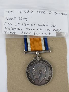 A WWI British War Medal, Norfolk Regiment PTE R Ducker 7382.