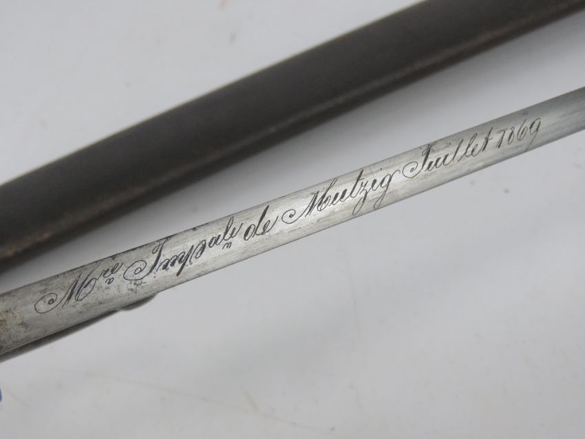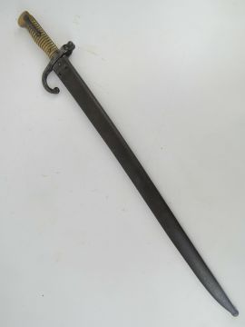 A French Chassepot 1869 bayonet and scabbard, engraved to back edge, numbered 17829, having hook quillion and scabbard, blade measuring 57.5cm.