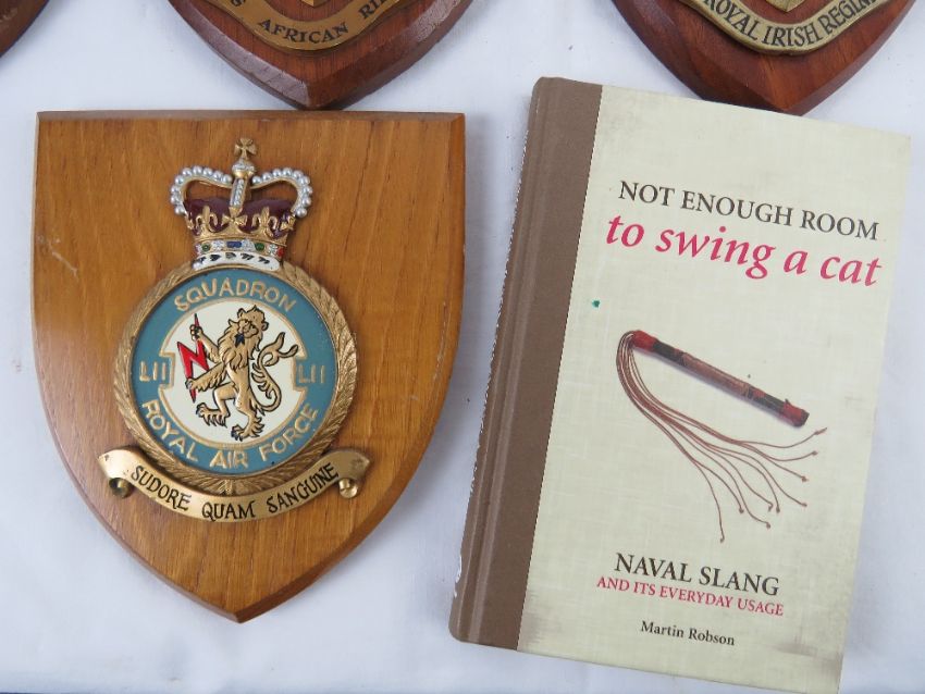 Nine assorted regiment plaques and book of naval slang 'Not Enough Room To Swing A Cat'.