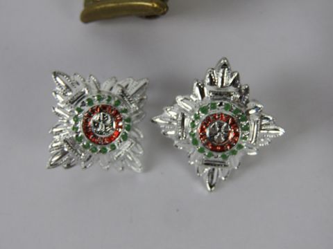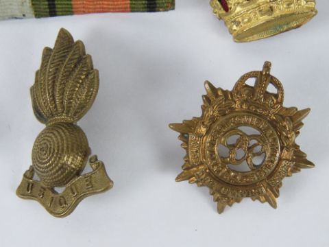 A quantity of British military cap badges together with a medal bar and a commemorative Waterloo pin badge.