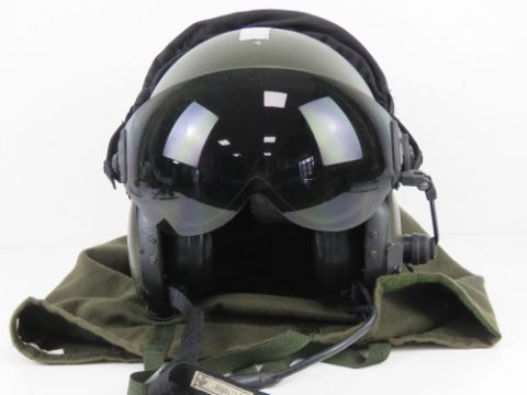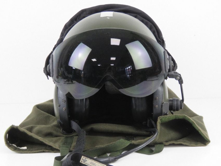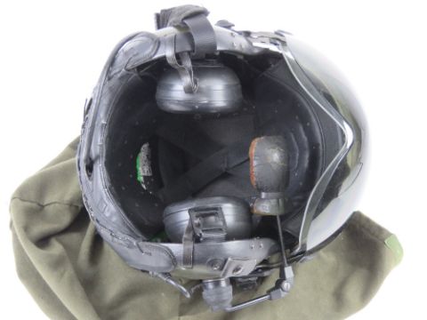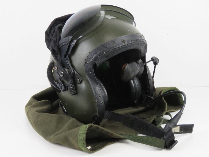 An RAF Mk3C pilots helmet with visor cover and storage/carry bag.