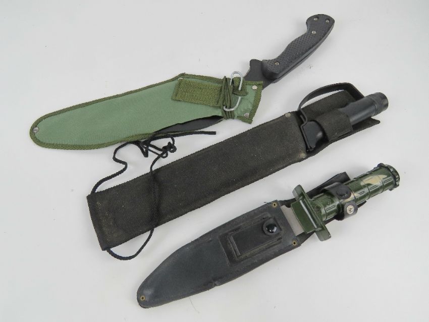 A contemporary survival knife having saw back blade and handle opening to reveal matches, fishing hook and line, in scabbard. Together with a contemporary kukri style dagger and another survival dagger with saw back blade with matches, fishing hook and line, in scabbard.