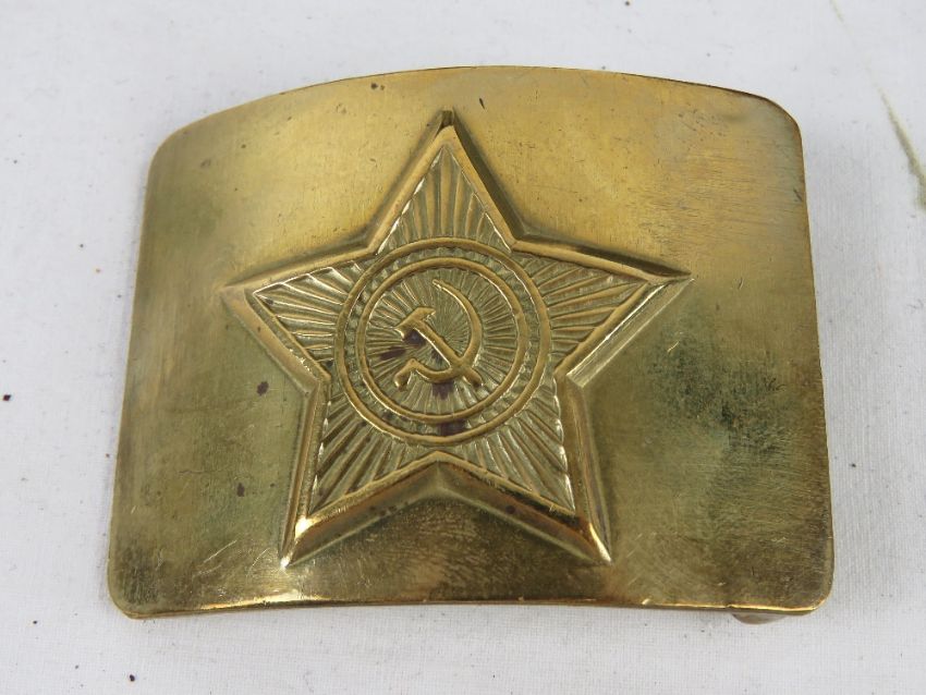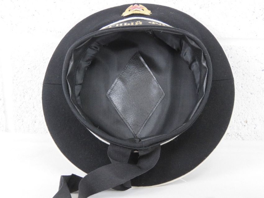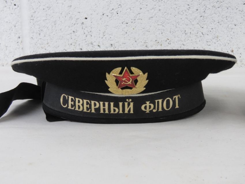 A Russian Navy cap with ribbon, a Russian Budenovka hat and a Russian Army brass belt buckle.
