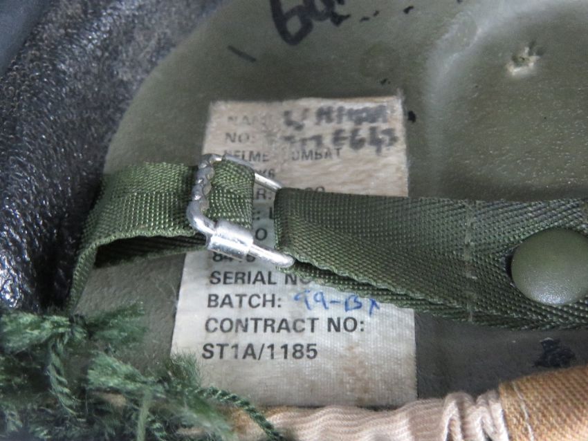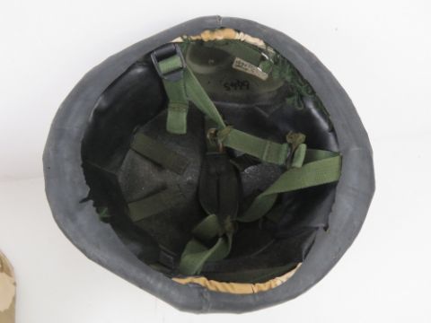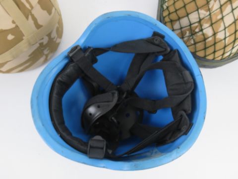 Two British Mk 6 helmets, one with helmet net size L. Together with a UN Blue Ballistic helmet. Three items.