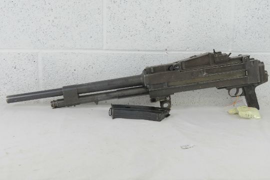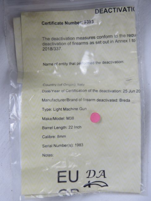 A deactivated Breda M38 7.92mm Tank Heavy Machine Gun having wartime Italian Fascist stamps upon, with pintle mount. Moving bolt (under spring pressure), moving trigger and safety, bolt release, opening top cover, and removable magazine. With EU certificate.