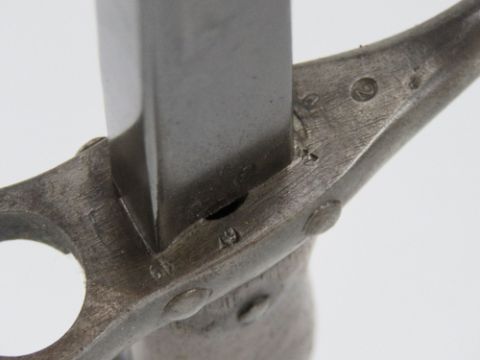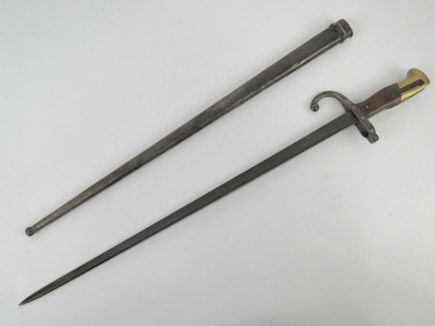 A French 1874 pattern Gras bayonet with scabbard, engraved to spine "Mre d'Armes de St. Etienne 1876".