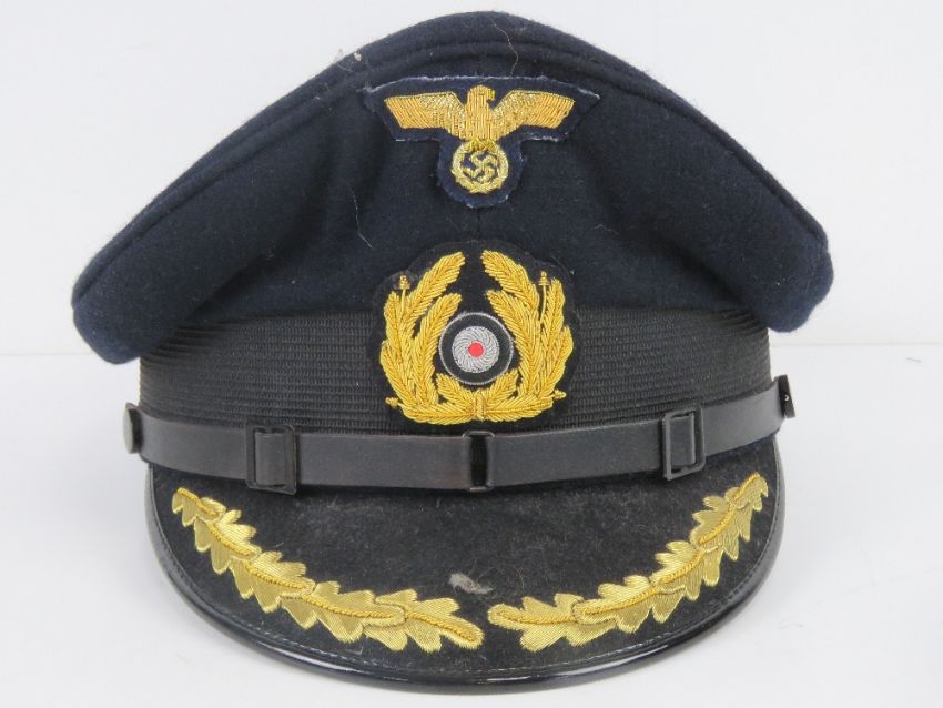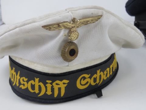 A reproduction German WWII Kreigsmarine cap (size 59) together with a reproduction German WWII Splinter camo field cap (size 60) and a reproduction White Kriegsmarine hat (size 56).