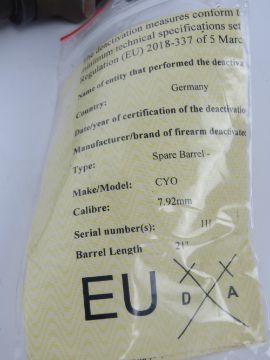 A deactivated WWII German MG42 Spare Barrel, 7.9X57MM, with EU certificate.