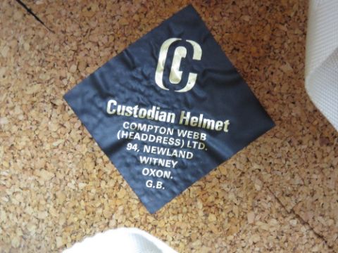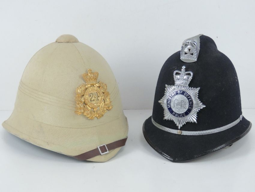 Two reproduction British helmets being a Ministry of Defence Police helmet made by Compton Webb Oxford and a Pith helmet having 24 badge to front.