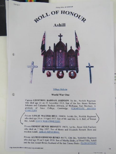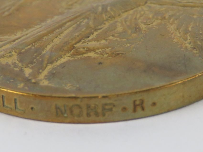 A WWI British Victory Medal, Norfolk Regiment, PTE Leslie Walter Bell 200436. Together with paperwork regarding Leslie Walter Bell inc copy Commonwealth War Graves certificate and family census records.