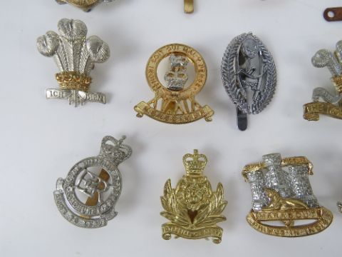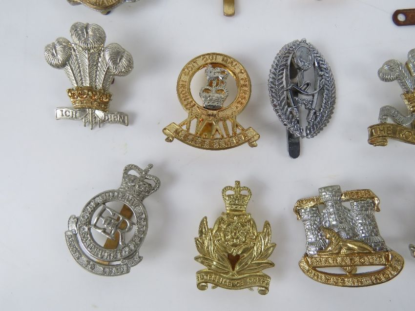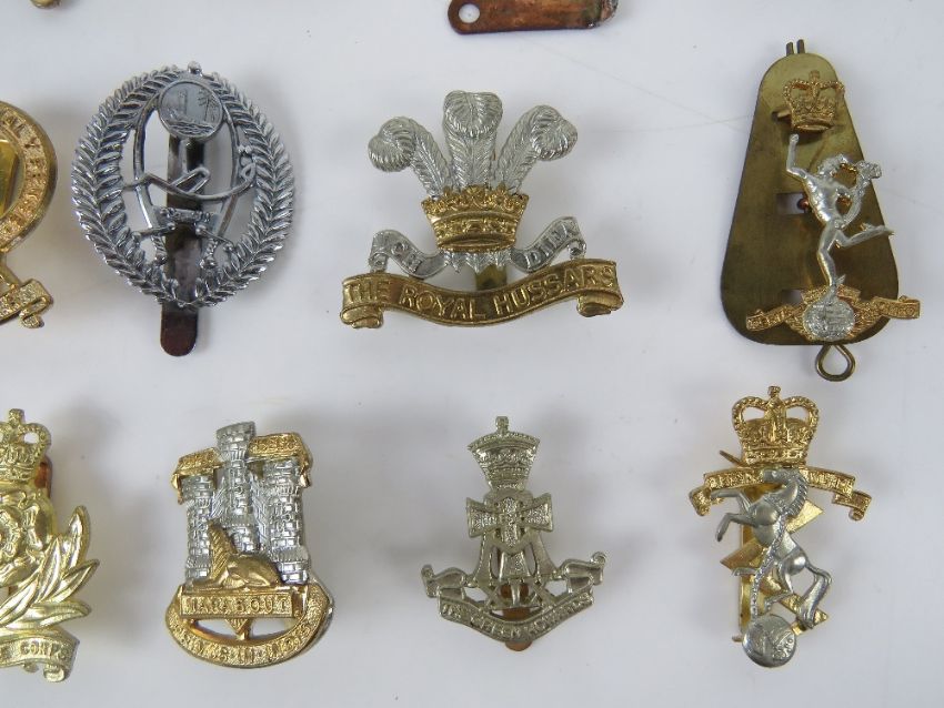 An assorted British regiment cap/helmet badges, approx 20 items, inc The Royal Scots, RAF, Royal Hampshire, Royal Military Acadamy Sandhurst, Intelligence Corp, Royal Engineers, Royal Hussars, HM silver ARP badge a/f, etc.
