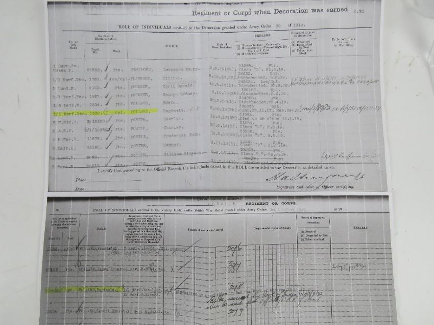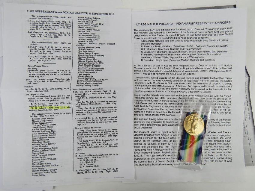 A WWI British Victory Medal, Norfolk Regiment, 2nd LT R.Pollard. With documents relating to Reginald C Pollard inc copy medal roll index card, copy Regiment lists, copy London Gazette mentions and a short history of his service career.
