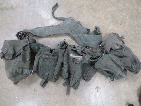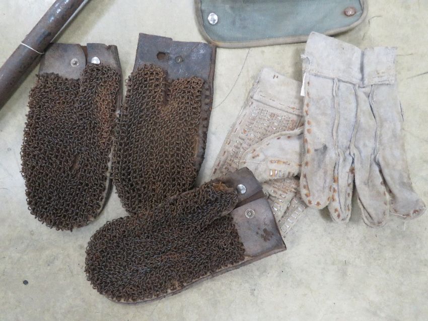 A pattern 58 webbing set, mortar brush and a pair of gloves, three pairs of chain mail gloves and two map cases.