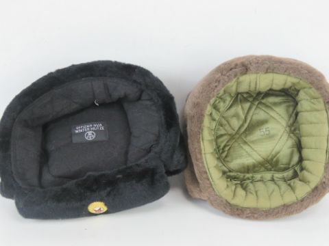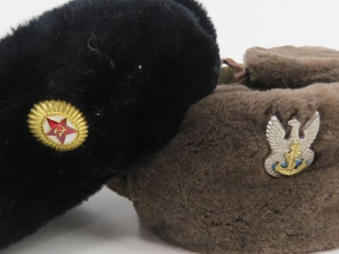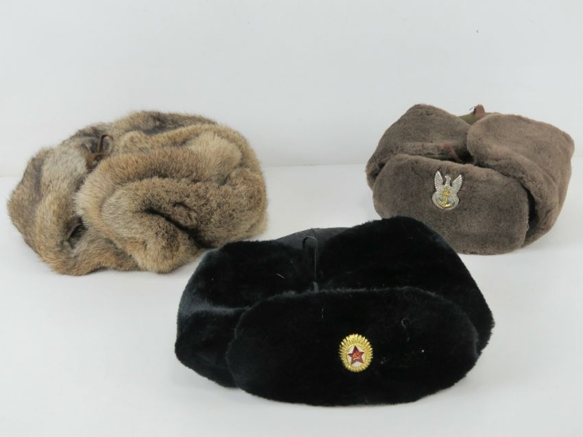 Three Russian winter hats, one bearing Soviet Military label upon, one being rabbit fur and one having Naval Military badge upon.