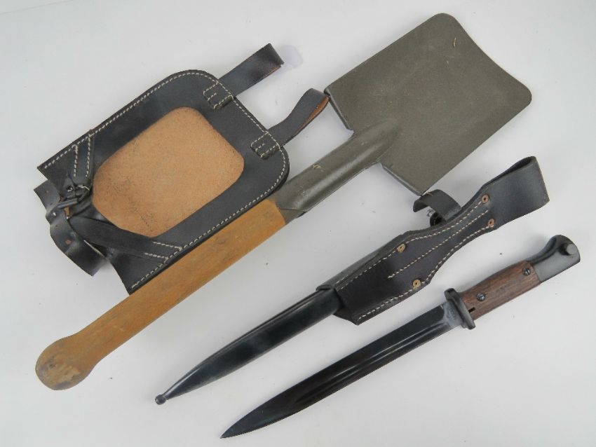 A trenching tool in leather sheath, together with a reproduction K98 bayonet with scabbard and frog.