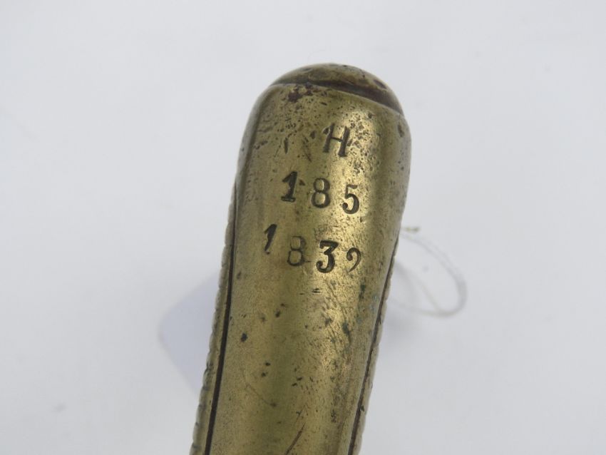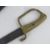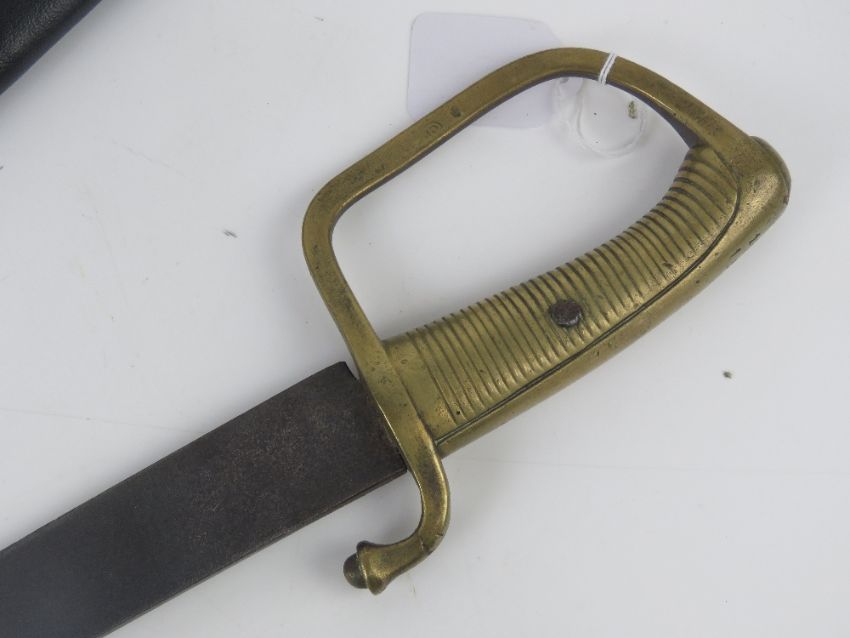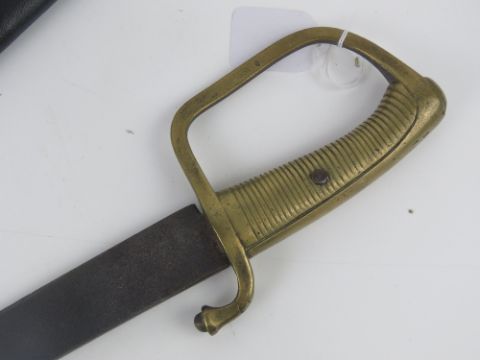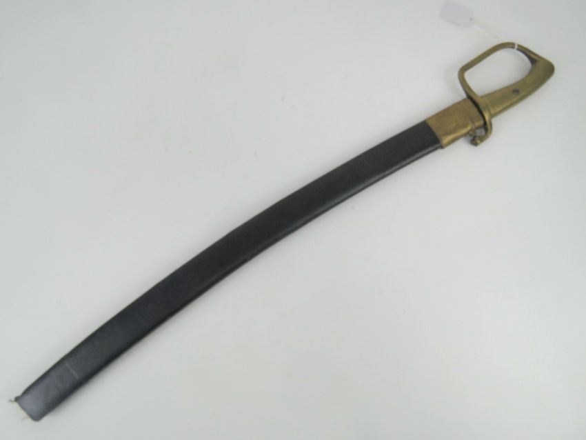 A cavalry sword having curved blade, brass grip and leather covered scabbard.