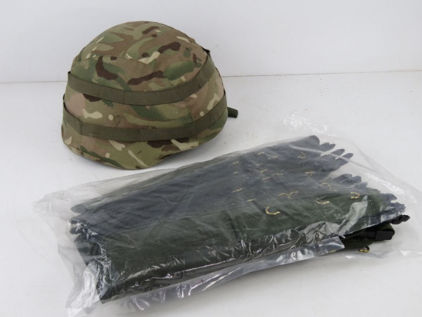 A British Military MK7 helmet with MTP helmet cover, size small. Together with ten SA80 scabbards 'as new' in packet.