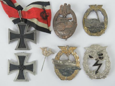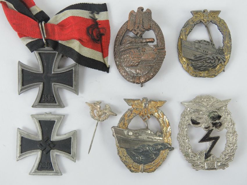 A quantity of reproduction WWII German medals and badges inc Iron cross. Seven items.